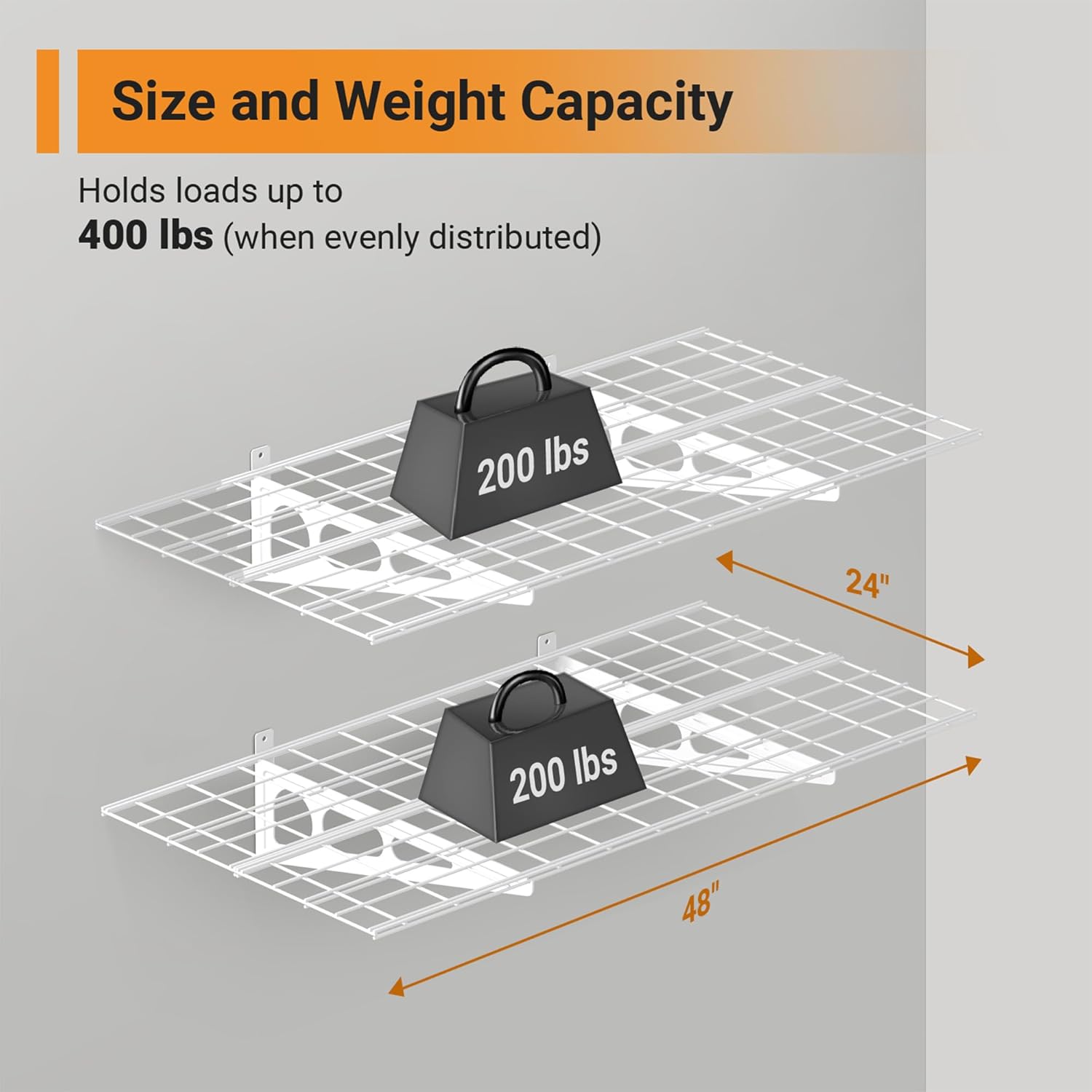 2x4 ft Garage Shelving, 2-Pack Wall-Mounted Shelves for Garage, Kitchen, Pantry Storage, 400 lbs Total Load Capacity Wall Shelving, White