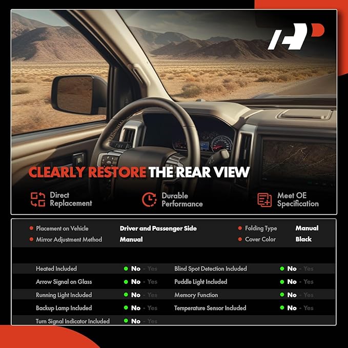 - [Specifications]: ①Position: Driver and Passenger Side; ② Color: Black; ③ Mirror Adjustment Method: Manual; ④ Folding Type: Manual; ⑤ Heated: No; ⑥ Arrow Signal on Glass: No; ⑦ Running Light: No; ⑧ Backup Lamp: No; ⑨ Turn Signal Indicator: No; ⑩ Blind Spot Detection: No; ⑪ Puddle Light: No; ⑫ Memory Function: No; ⑬ Temperature Sensor : No