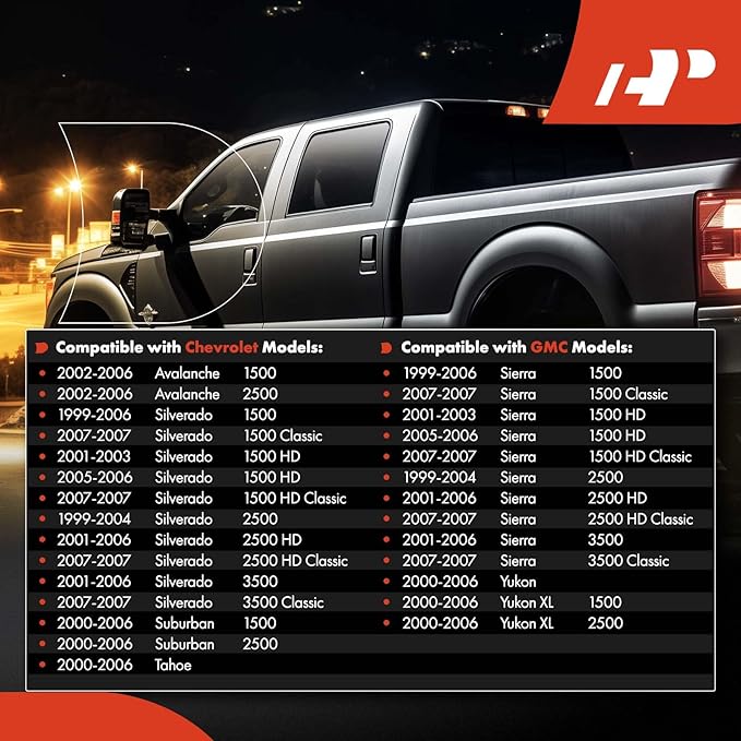 - [Vehicle Fitment-2]: Compatible with GMC Sierra 1500 1999-2006, Sierra 1500 Classic/Sierra 1500 HD Classic/Sierra 2500 HD Classic/Sierra 3500 Classic 2007, Sierra 1500 HD 2001-2003, Sierra 1500 HD 2005-2006, Sierra 2500 1999-2004, Sierra 2500 HD/Sierra 3500 2001-2006, Yukon/Yukon XL 1500/Yukon XL 2500 2000-2006