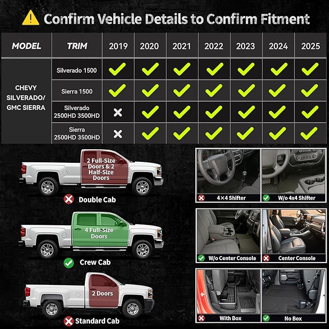 - Custom Fit: Built exclusively for 2019-2026 Chevy Silverado/GMC Sierra Denali 1500 & 2020-2025 Silverado/Sierra 2500HD/3500HD Crew Cab Without Rear Underseat Storage Box; Distinct precision digital laser scanning allows it to consistently hug the contour of your ride’s interior