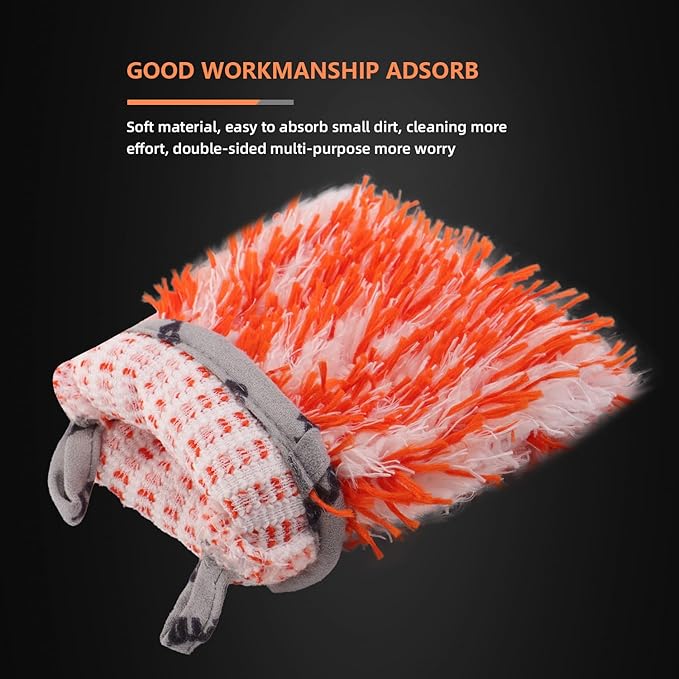 - Wide Usage Aread:Premium fibers safely agitate stubborn brake dust, dirt, and grime for a complete clean, just the professionals, at home Thumb loop helps keep the car wash mitt securely on your hand for easy control while the soft inner lining and padding offer comfort during your car wash.Car wash glove will become a must-have for your car cleaning supplies and car detailing kit; Also great to use on motorcycle, bike, trailer, and other wheels