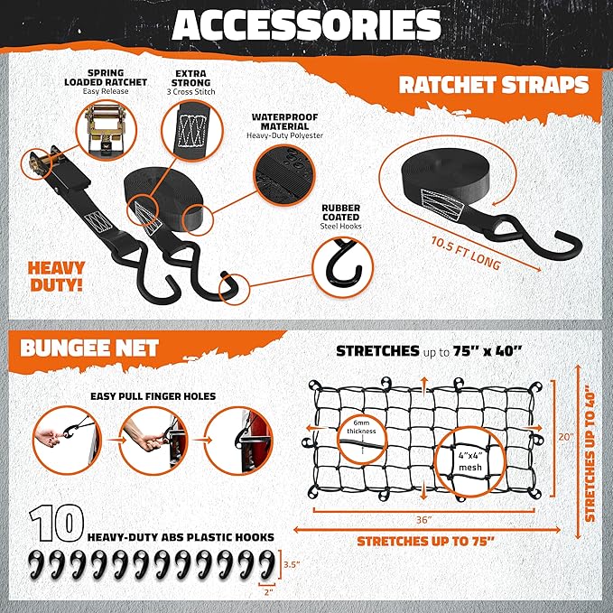 - Comes With Roof Carrier Accessories: The Mockins Roof Rack Basket Cargo Carrier Set includes a 6mm-thick rooftop basket net, measuring 36"x20" & expandable to 75"x40". Featuring 4"x4" mesh openings & 10 ABS hooks with easy-grip finger holds, the net snugly fits both large & small loads on your car & SUV roof rack cargo carrier . Two sets of 10 ft ratchet straps help anchor your load, while the wind fairing roof rack carrier design reduces drag & noise—ideal for more efficient road adventures.