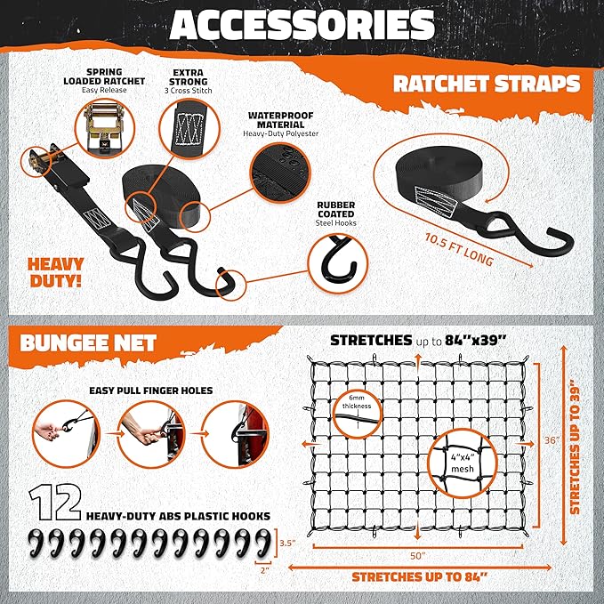 - Reliable Rooftop Cargo Rack Accessories: Our cargo racks for roof storage come with a durable 6mm-thick roof carrier net built for vehicle cargo baskets . Sized at 50"x36" it stretches up to 100"x75" with 4"x4" mesh squares & 12 ABS hooks featuring easy-grip finger holds. This bungee net makes stabilizing gear in your rooftop basket fast, simple & convenient. Further secure belongings in your roof rack basket cargo carrier with the three included 10.5 ft ratchet straps for the steadiest haul.