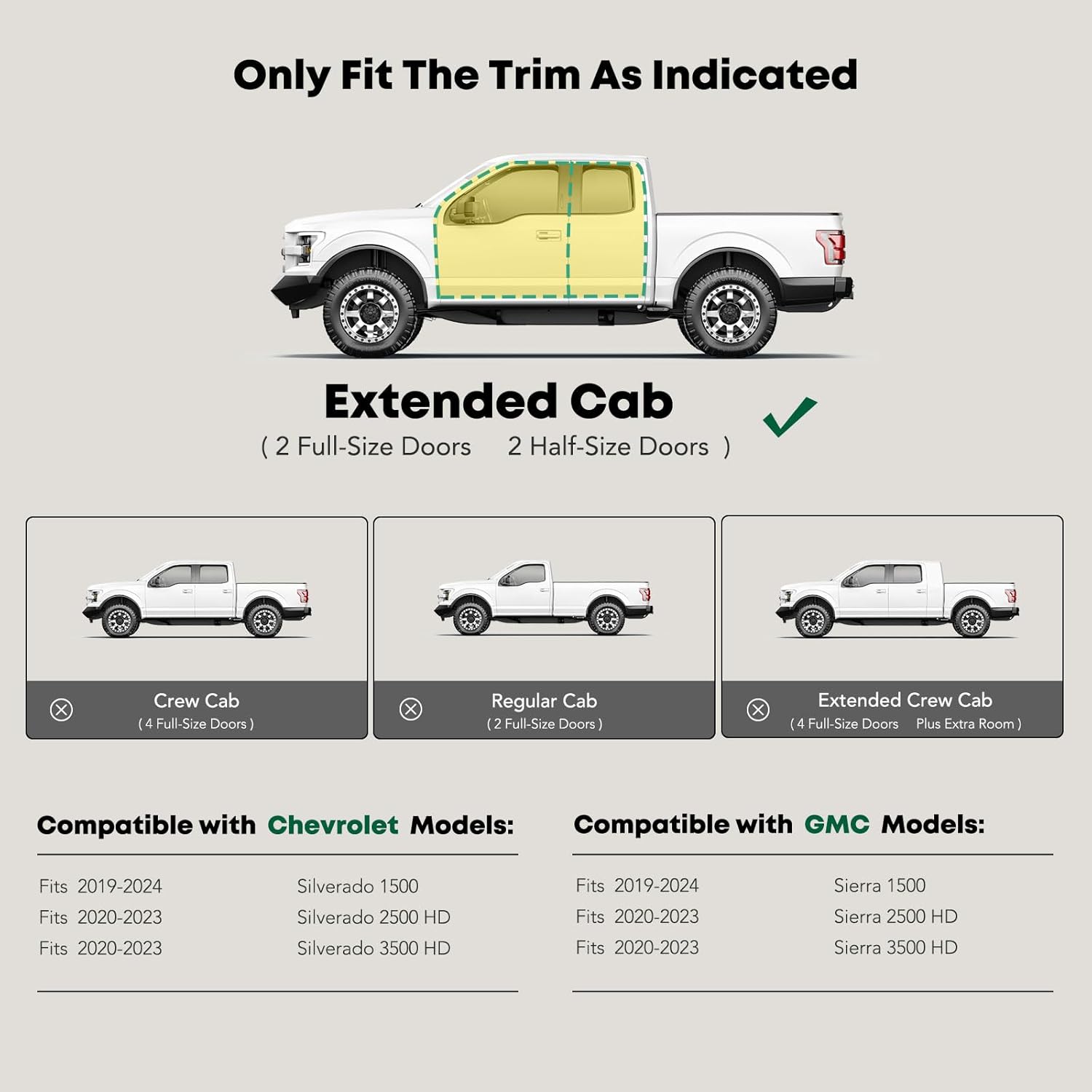 - Confident Fitment: Wheel-to-wheel side steps are compatible with the Chevrolet and GMC Models: Silverado/Sierra 1500 2019-2024, Silverado/Sierra 2500 HD 2020-2024, Silverado/Sierra 3500 HD 2020-2024, Extended Cab(2 Full-Size Doors with Half Doors), 6.5 FT Standard Bed Only