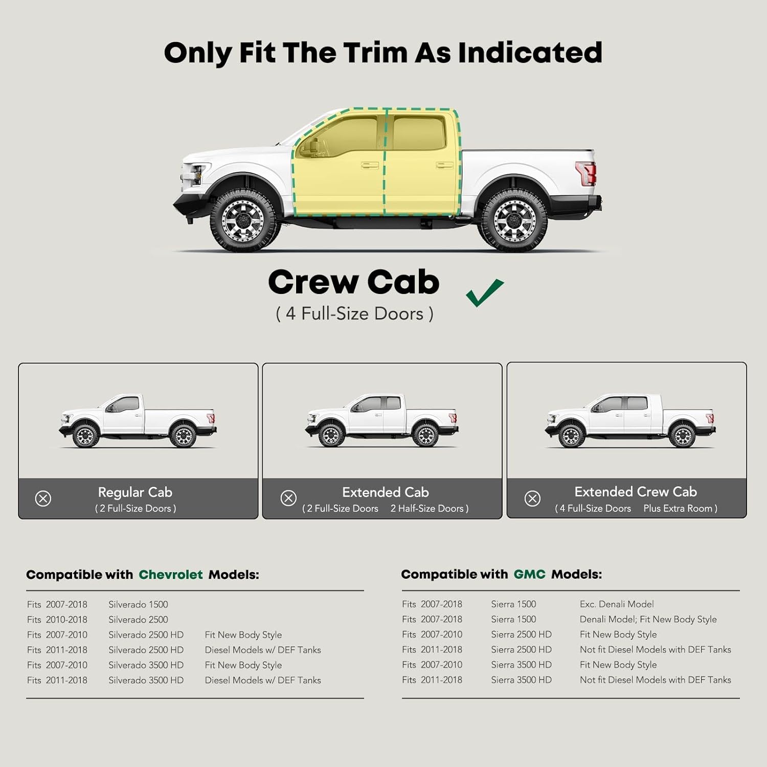 - Confident Fitment: Cab length side steps are compatible with the Chevrolet and GMC Models: Silverado/Sierra 1500 2007-2018, Silverado 2500 2007-2018, Silverado/Sierra 2500 HD 2007-2019, Silverado/Sierra 3500 HD 2007-2019, Crew Cab(4 Full-Size Doors)