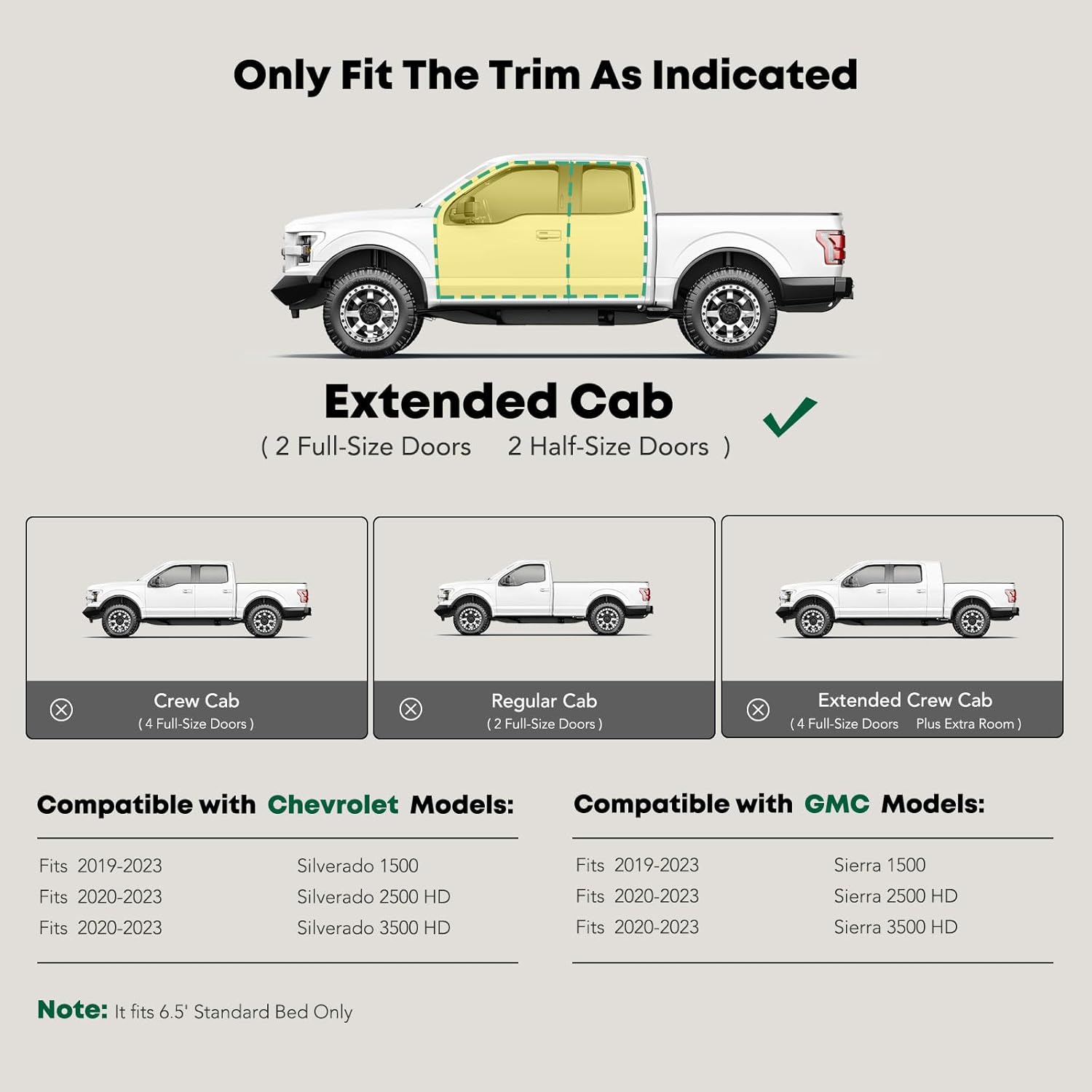 - Confident Fitment: Wheel-to-wheel side steps are compatible with the Chevrolet and GMC Models: Silverado/Sierra 1500 2019-2024, Silverado/Sierra 2500 HD 2020-2024, Silverado/Sierra 3500 HD 2020-2024, Extended Cab(2 Full-Size Doors with Half Doors), 6.5 FT Standard Bed Only