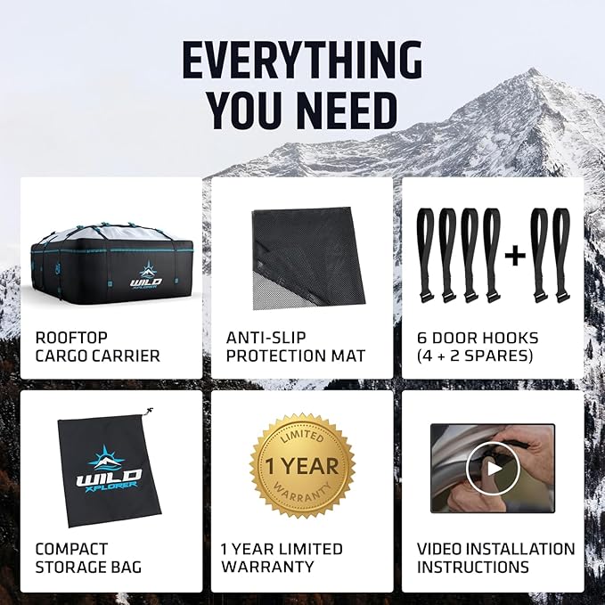 - What’s Included: 1x car roof cargo carrier (23 cubic feet), 4x door-hook straps (+2 extra), 1x anti-slip mat (39” square), and 1x storage bag. We also offer a year-long warranty on our rooftop cargo bag—for total peace of mind.