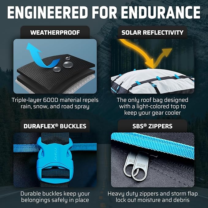 - New 2025 Model: Reengineered to improve durability and weather resistance. Our roof bag now features even tougher military-grade material (600D polyester), enhanced waterproofing, heat-welded seams, heavy-duty SBS zippers and trusted Duraflex buckles to keep your cargo dry, safe and secure.