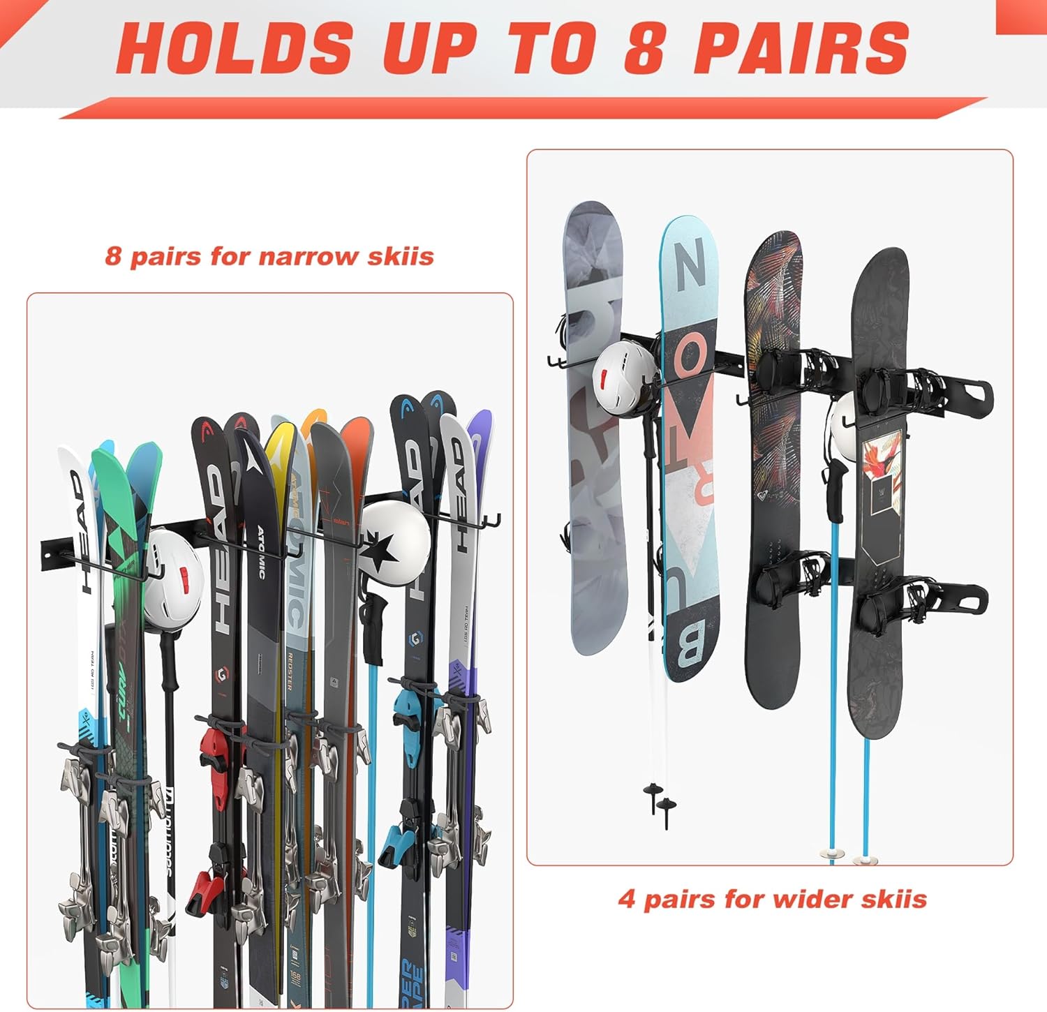 WALMANN Garage Ski Rack, Indoor Ski Hangers for Garage Ski Storage Wall Mounted Ski Holder Holds Up to 8 Pairs of Skis