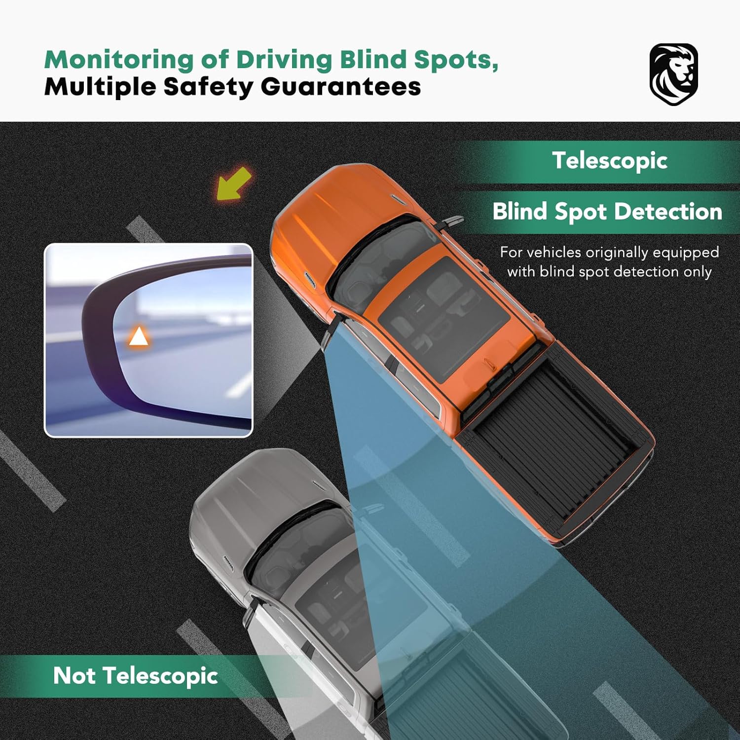 - Incredible Functions: â‘ Power adjusted for in-car angle adjustment (powered flat mirror, manual convex mirror); â‘¡Power heated for quick defogging or defrosting in cold or wet weather; â‘¢Blind spot detection detects and warns of side and rear blind spots; Plug-and-play multi-function car mirrors with manual telescoping and folding for a safer, more confident journey