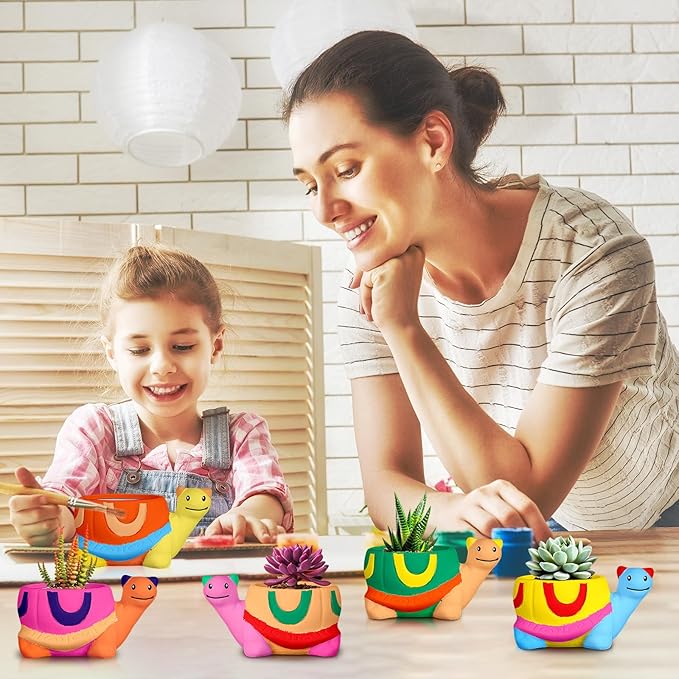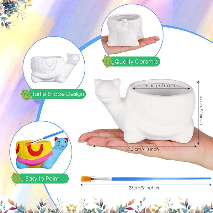- Sufficient Quantity: you will receive 6 sets of DIY ceramic turtle planters paint craft kit, includes 6 pieces of unpainted turtle flowerpots, 12 colors of mini acrylic paints, 2 pieces of paint brushes and 1 piece of palette, enough in quantity everything you need to unleash your inner artist