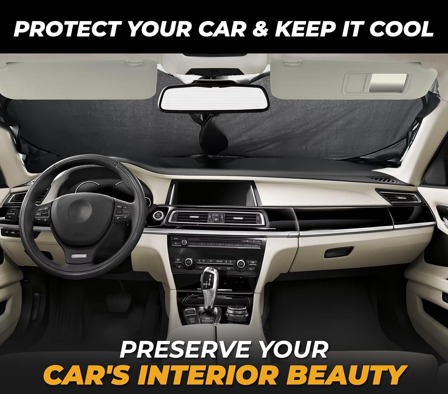 - 【Durable & Heat-Resistant Material】 – Built from premium, reflective 240T polyester, this windshield sunshade is designed to withstand extreme temperatures without fading, tearing, or warping—offering long-lasting performance and interior protection.