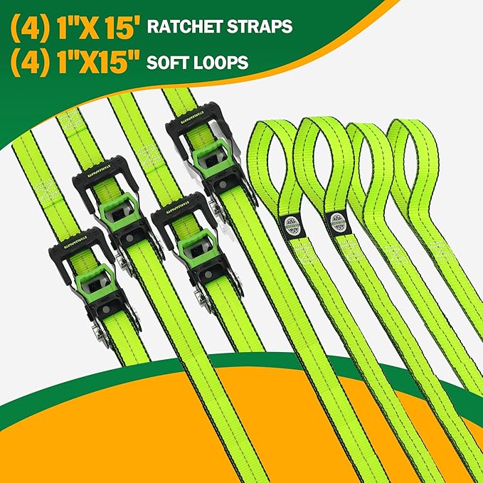 - 【Ratchet Straps Kit】 – These heavy duty ratchet straps come in a convenient 4-pack, includes (4) 1" x 15' ratchet straps with (4) 1" x15”soft loops | (4) coated S hooks & padded handles | (1) set velcro straps | (1) carrying bag | small gift attached | 2100 lbs breaking strength.