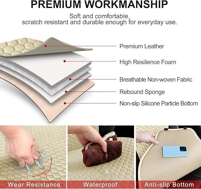- 【PREMIUM MATERIAL】 The auto seat covers are made of high-quality faux leather, which is soft, waterproof, durable, and scratch-resistant. The highly flexible sponge in the built-in layer added comfort. The bottom of leather seat covers are rubber sole which prevent falling off from your car seats.