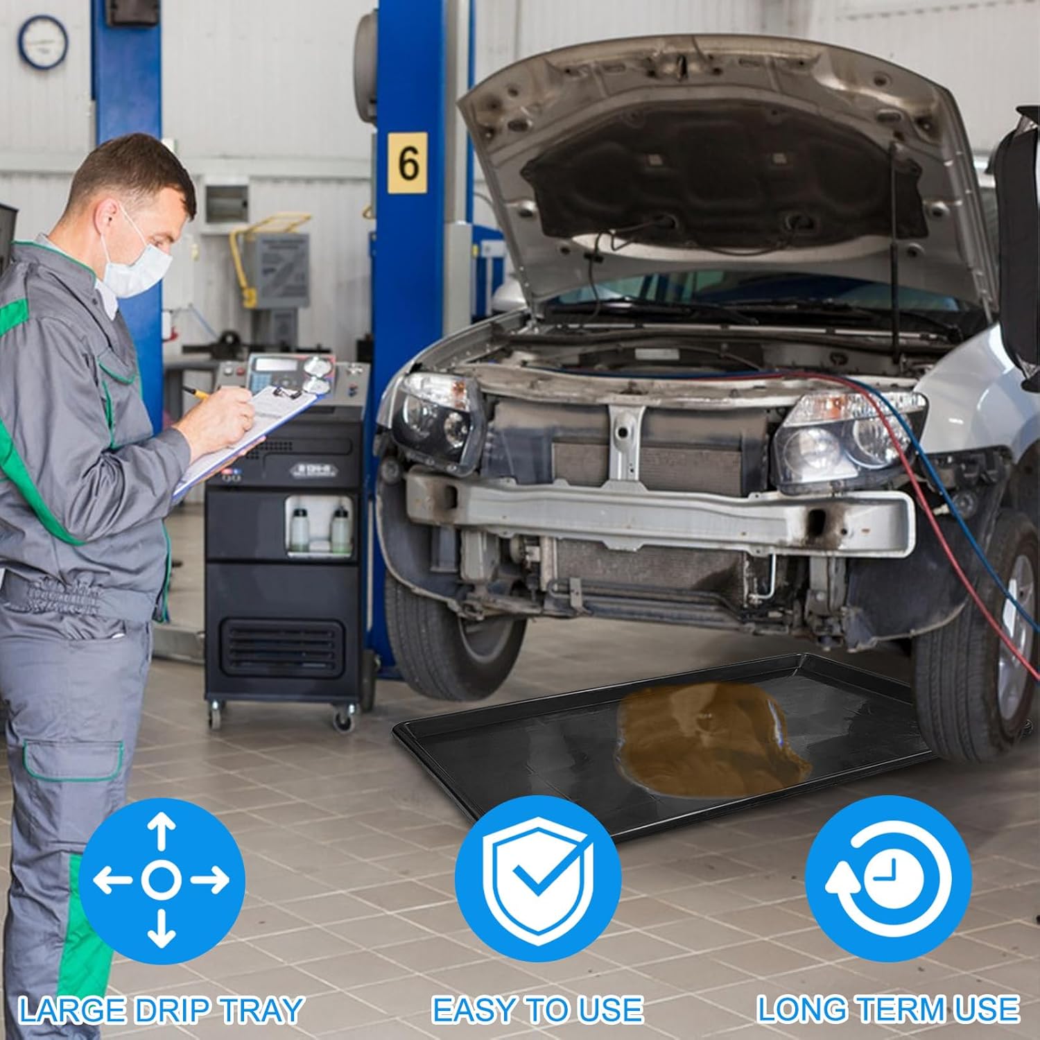 - High Lip Anti-Spill Design: The raised outer edge of the car oil drip pan can effectively prevent oil or other liquids from overflowing, so as not to cause floor contamination and damage. You can always keep your garage, driveway or car showroom floor safe and clean from liquid drips.