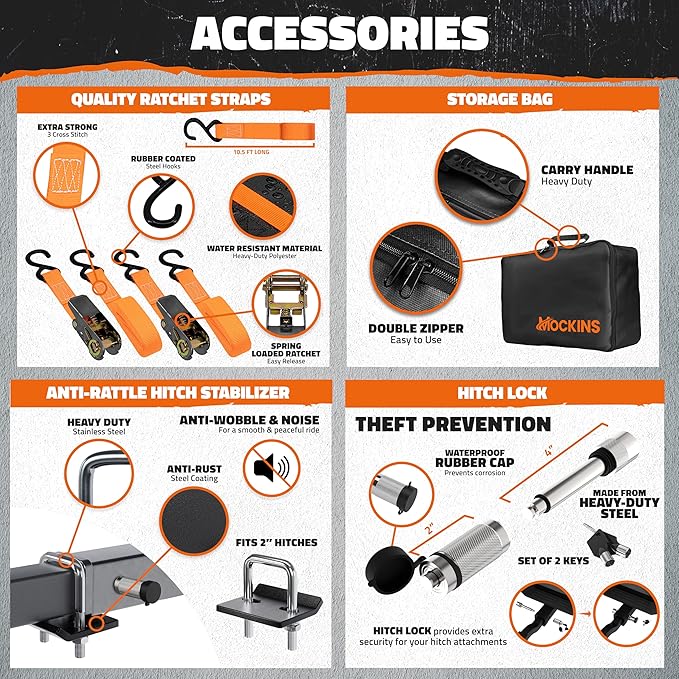 - SMOOTH TRAVELS, EVERY TIME: Equip yourself for effortless hauling with the 500 lbs. capacity trailer hitch rack cargo carrier , complete with stabilizer & reflectors. The luggage rack for hitch set also includes a waterproof truck bed storage bag with combo lock & carry bag for added convenience. Keep your gear secure with a hitch lock, license plate bracket, 3 buckle straps & 3 ratchet straps. Transform the way you travel with the Mockins Folding Hitch Cargo Carrier & Hitch Cargo Bag Bundle.