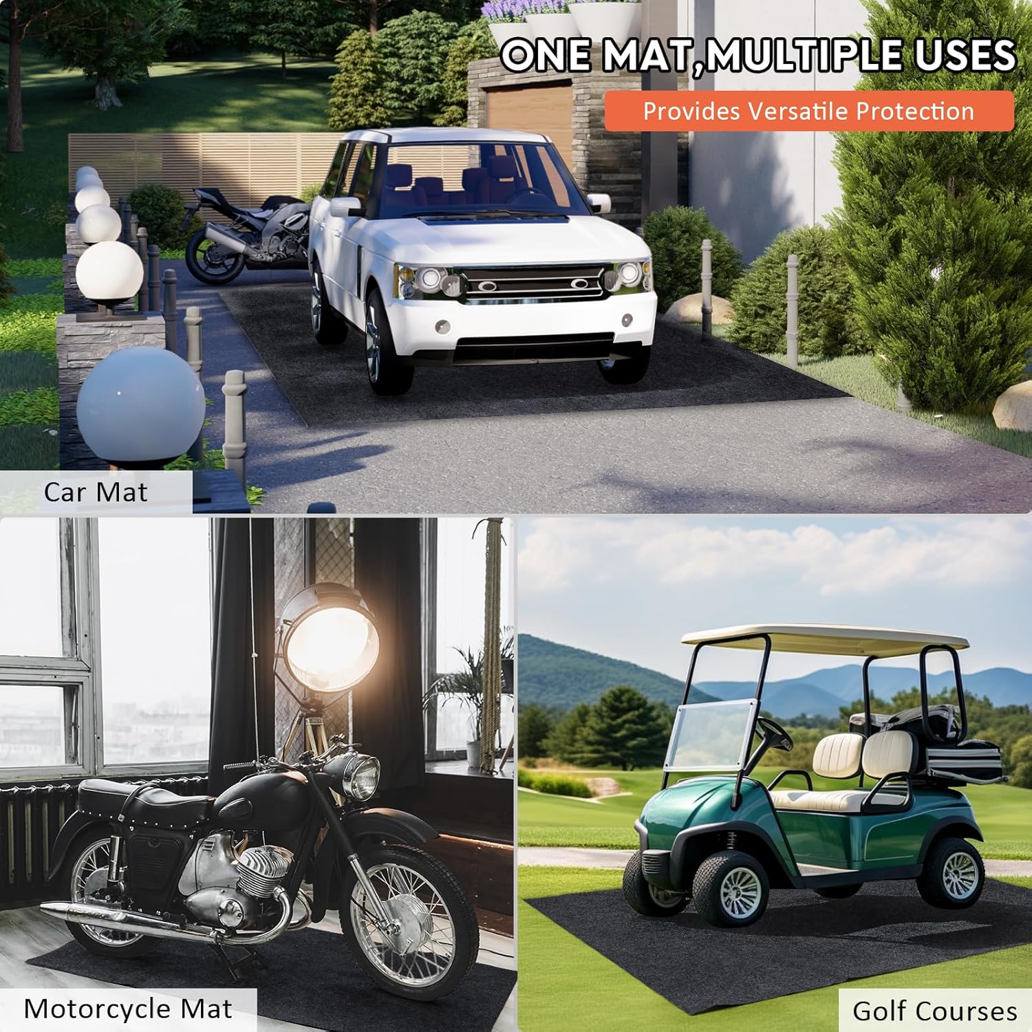 - Multi Purpose to Use: Parking mats ideal for garage floors, suitable for cars, golf carts, motorcycles, and versatile use under garbage cans, appliances, gardening tools, lawn mowers.