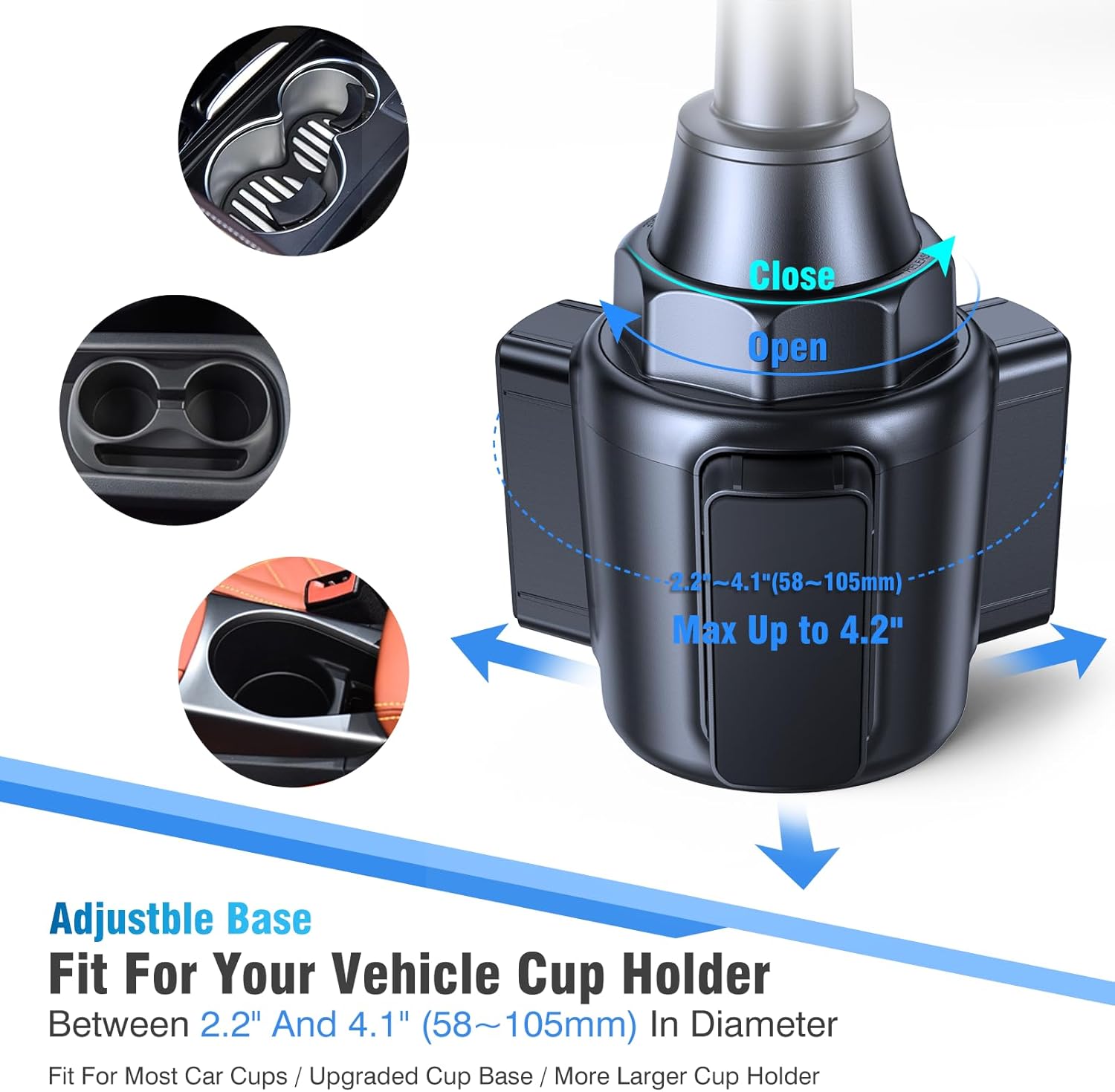 - Upgraded Expandable Base and Release Easily: Miracase cup holder phone mount base can be adjusted from Min.2.3" to Max.4.2", fits most car cup holder,no need extra tools, you can get three packs of silicon slice for the base extension support to fit larger cup holder. Featuring one-button release curved arm and extendable feet,It ensures safe driving whether you are talking, navigating, listening to music or charging.
