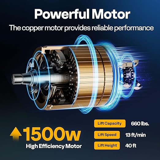 - POWERFUL MOTOR - Equipped with a 1500W copper motor, our portable electric hoist winch has a lifting capacity of up to 660 pounds, stable performance, and low power consumption; The powerful motor enables a lifting speed of up to 13 ft/min and a lifting height of up to 40 feet; Note: Do not operate with an empty load during initial use