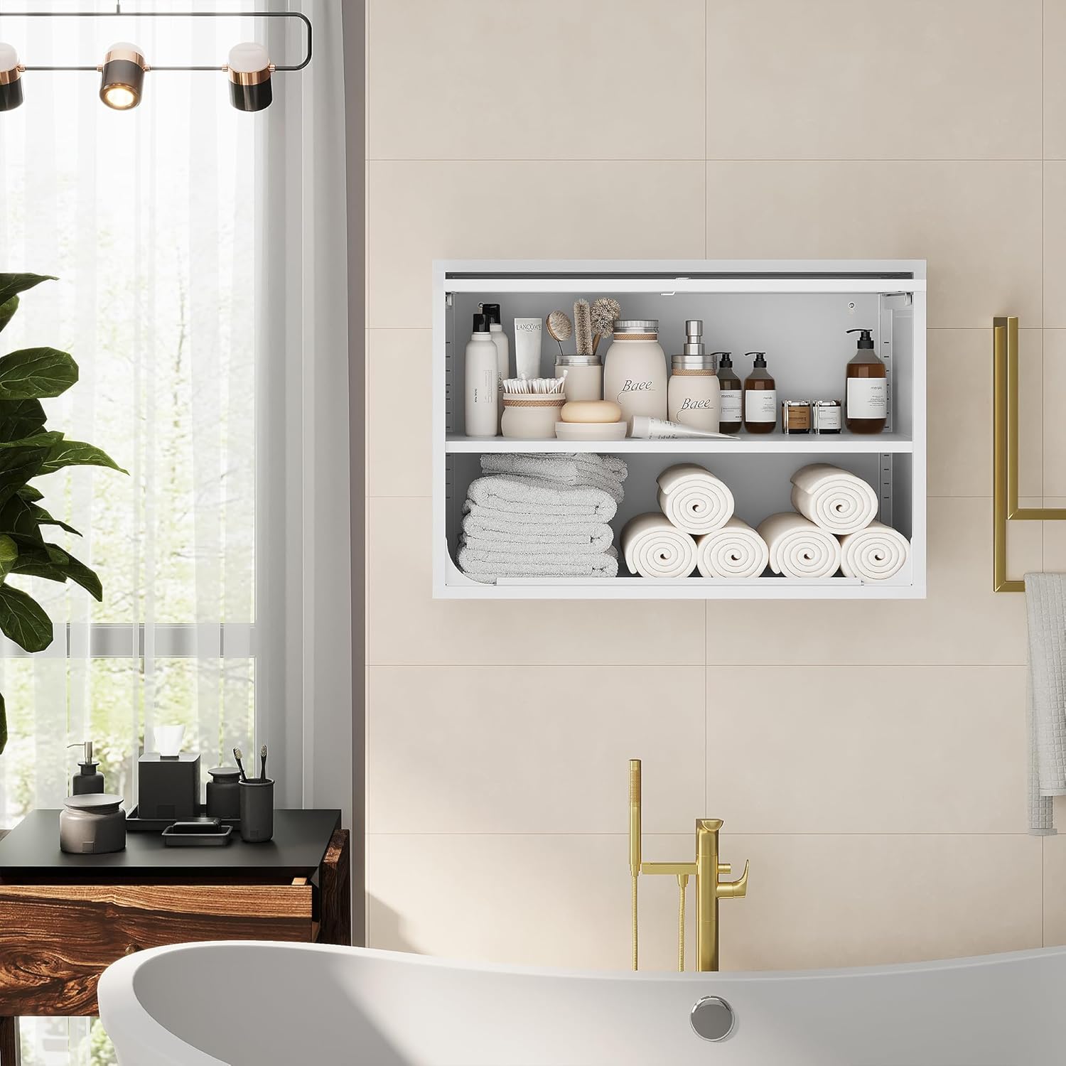 - Revolutionary Upgraded Opening and Closing System: Traditional left-right opening methods carry a risk of bumping heads. Our storage cabinets feature a unique top-bottom opening mechanism, where the entire door can be recessed into the cabinet itself, making full use of upper space and facilitating easy access to items stored inside.