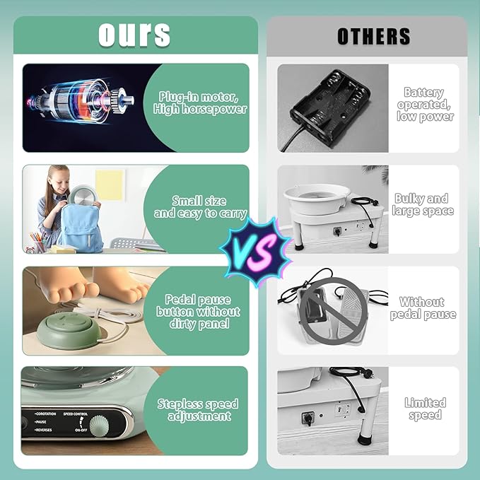 - Upgrade Pedal Pause, Easy To Operate: Upgrade the pedal pause button to make the clay shape simpler. Through the pedal pause button, the turntable speed is paused without dirty panel pause button. Equipped with clockwise and counterclockwise rotation, it is often suitable for ceramic artists who are used to right and left -handed