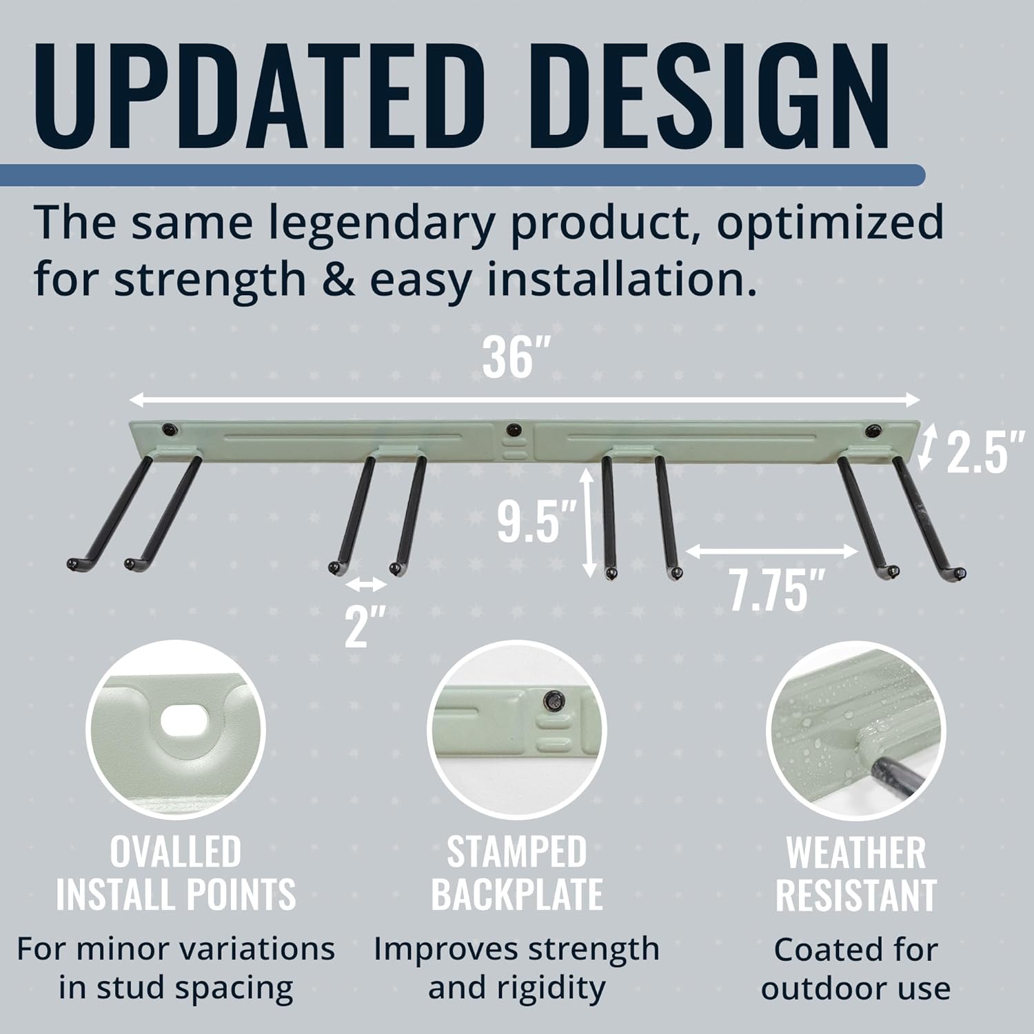 - RECLAIM YOUR GARAGE – Conquer clutter with this garden tool organizer designed for garage storage, sheds, or workshops. Measuring 36" L x 9.5" W x 2.5" H, it features four PVC-coated garage hooks and a 250 lb weight capacity, ideal for storing shovels, brooms, rakes, and power tools. Installs with 3 heavy-duty lag screws directly into 16" wall studs for secure, long-lasting support.