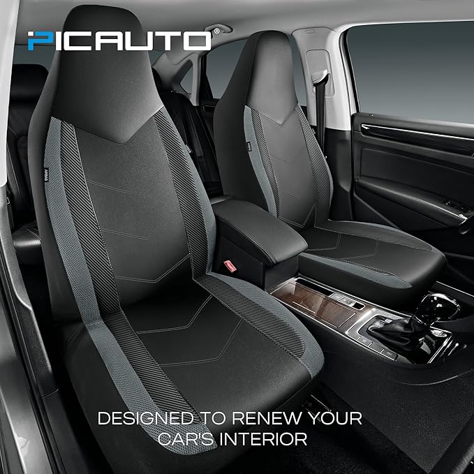 PIC AUTO Leather Car Seat Covers, Sports Carbon Fiber & Mesh Design, High-Back Full Set, Waterproof Automotive Seat Covers, Airbag Compatible, Universal Fit for Cars, SUVs, Trucks (Black & Gray)