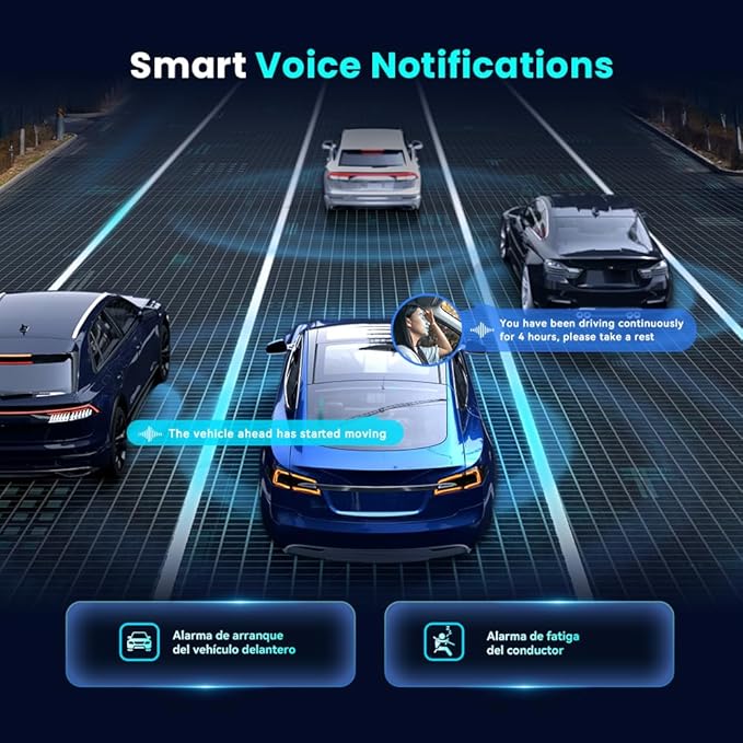 - 【Smart Voice Reminder with ADAS】The N5 Dual dash camera is equipped with ADAS, providing reminders whit front starts moving and fatigue driving reminder. This driver fatigue alarm is your safety guarantee for safe and easy driving, especially suitable for long-distance driving or night driving. If the vehicle ahead starts moving, the car camera N5 Dual will alert you to begin driving, helping you avoid being honked at by the car behind.