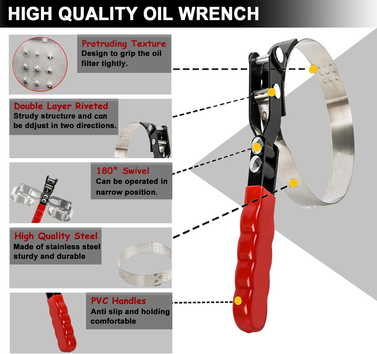 - Premium Quality: The oil filter tool is made from premium stainless steel, corrosion-resistant, highly strength and durability, ensuring long-lasting performance. The handle is made of PVC material, providing a comfortable grip and anti-slip functionality.