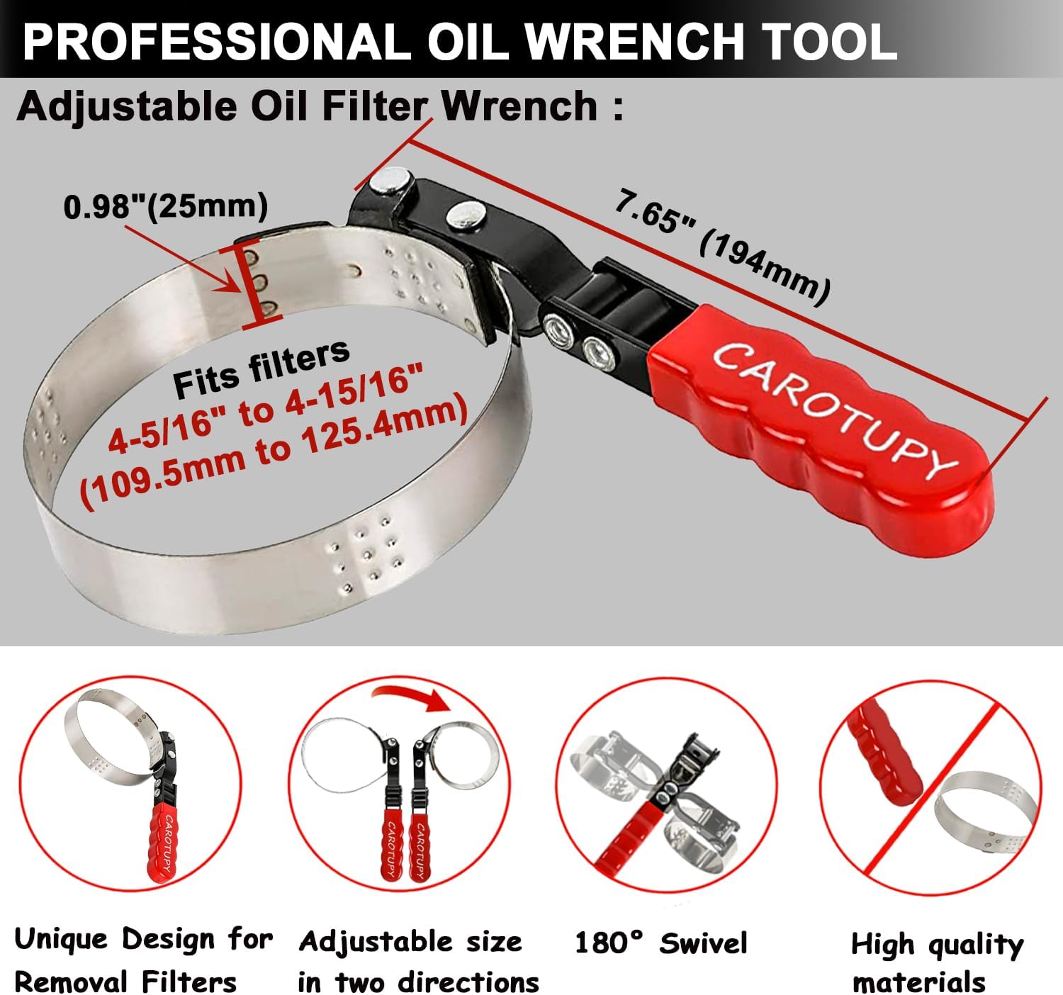 - Oil Filter Wrench Tool: The oil filter tool with a range from 4-5/16" to 4-15/16"(109.5 mm to 125.4 mm) is ideal to remove and repair oil filters easily from cars, motorcycles and trucks etc. Satisfy your daily demands and meet your work needs for maintenance of oil filters and oil change.