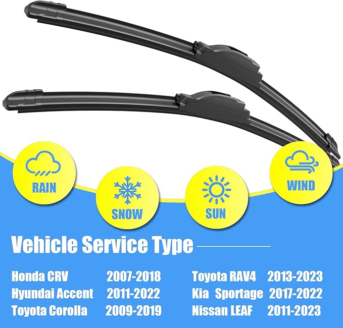 - 【FITMENT】: Replacement for 2007-2018 Acura RDX,2007-2018 Honda CR-V,2011-2022 Hyundai Accent,2017-2020 Hyundai Elantra,2019-2023 Hyundai Santa Fe,2016-2018 Hyundai Tucson,2020-2023 Hyundai Tucson,2017-2022 Kia Sportage,2011-2023 Nissan LEAF,2015-2021 Subaru WRX,2009-2019 Toyota Corolla,2013-2023 Toyota RAV4 windshield wiper blades.