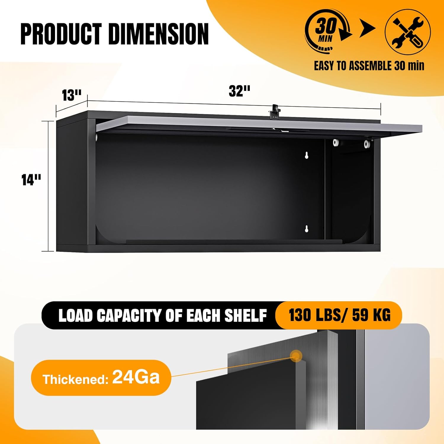 - ✅➤【High quality wall cabinet】:The Floating Metal Garage Cabinet is made of pressed sheet metal 0.65 mm SPCC steel plate. It is sturdy, and the steel is powder coated, which helps prevent rust. The robust steel construction can support up to 130 lbs for each shelf.