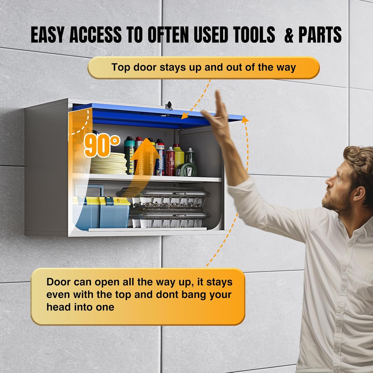 - ✅➤【High quality wall cabinet】:The Floating Metal Garage Cabinet is made of pressed sheet metal 0.65 mm SPCC steel plate. It is sturdy, and the steel is powder coated, which helps prevent rust. The robust steel construction can support up to 130 lbs for each shelf.