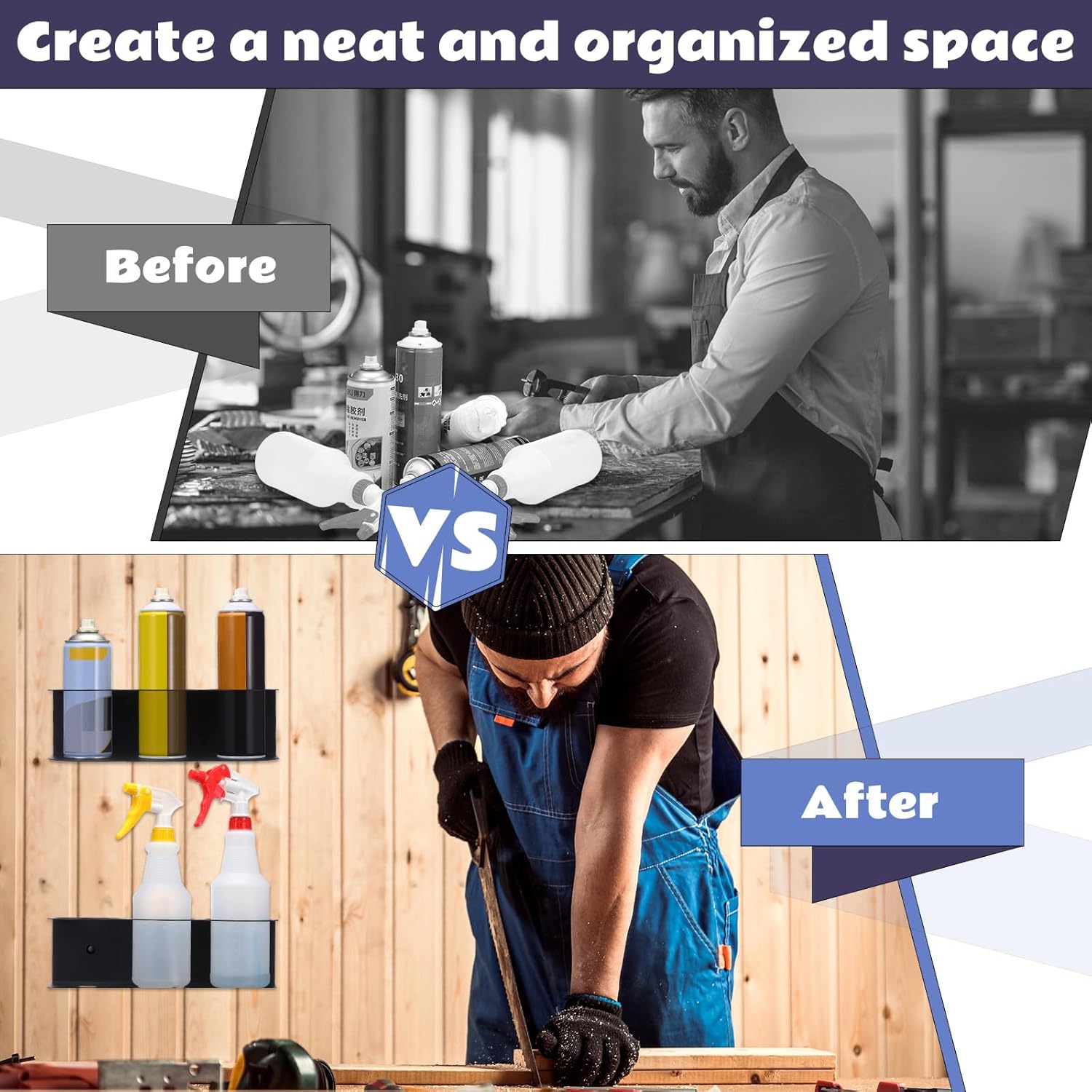 - Efficient Space Saver: the spray bottle organizer about 12 x 4 x 3.6 inches is designed to efficiently save space in garages, workspaces, and homes; Its compact design allows for maximum storage of up to 3 bottles while taking up minimal space, making it a nice addition for those looking to organize their work areas
