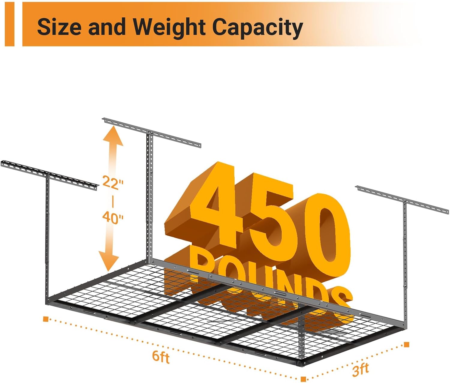 - Large Capacity: The 3x6ft overhead garage storage rack combines a weight-bearing capacity of 450 pounds, which provides a reliable storage solution.