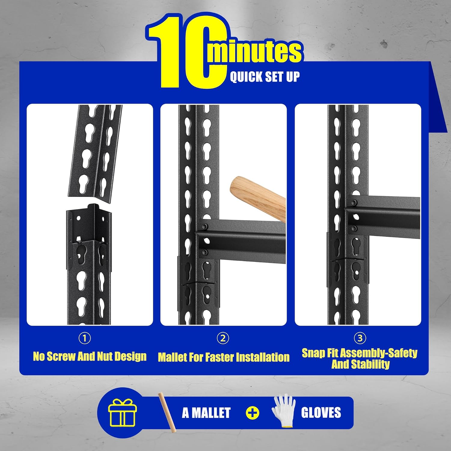 - ăSafeďźRust-ProofăThe entire all-metal shelves are locked by pins to ensure crossbeams stay seated and 4 support straps to prevent twisting or spreading. The powder-coated finish on the steel uprights, support straps, and crossbeams, easy to clean, moisture-proof and rust-proof.
