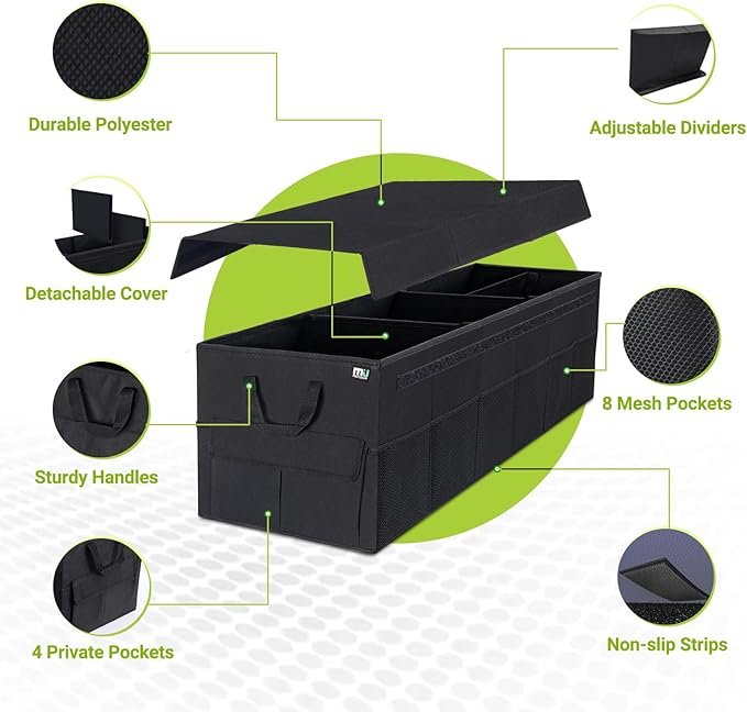 - 【Professional Service】- The package included trunk storage box x1, detachable coverx1,removable dividers x3, base plate x1, non-slip bottom velcrox4 sets. We stand by our product quality. The car storage organizer is perfect for any cars, vans, SUVs and trucks. We offer refund or free replacement for any problem, If you have any questions, please contact us.