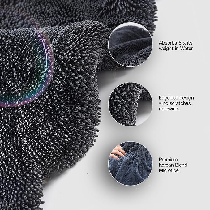 - TREAT YOUR PAINT WITH DELICACY: Crafted from 1300GSM thick Korean microfiber, these edgeless towels ensure scratch-free, gentle drying while protecting your car’s clear coat from micro-marring for a flawless finish