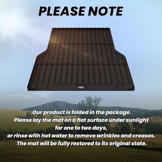 - 【Easy to Install & Remove & Clean】Lay the folded mat completely out in the truck bed and leave it in the sun for 1 day. If it is cloudy, leave it for 2 days. Or you can choose to rinse the truck bed mat with hot water to remove wrinkles and creases from the folded packaging. Once the mat is back in place, it can be removed and cleaned very quickly and easily by wiping it down with water or rinsing it with a high-pressure water sprayer.