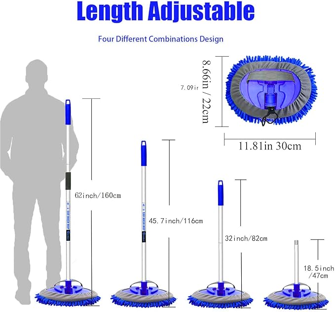 - 【Car Wash Mop With 62 inch Super-Long Handle】- Super-Long car wash mop will help you to clean the different height place where you can not reach by hand as the roof of the car. The car wash mop is made of aluminum alloy, which is harder than stainless steel, is lighter and has a longer lifespan! It can be extended to 62 inch, which ensures you can easily do a full cleaning.