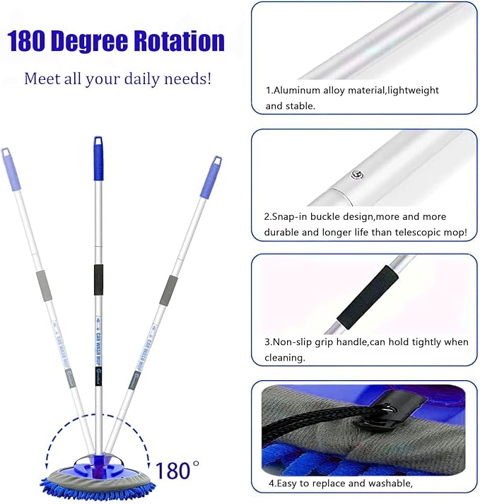 - 【180°Rotation Multi-Angle Cleaning】- The lightweight car wash mop has a non-slip grip to ensure it holds tightly, and also offers the 180-degree adjustable mop head, which helps you clean the different angle place easily, avoids bending to get everything done. You can manually adjust the handle length to meet your diffrent daily needs.