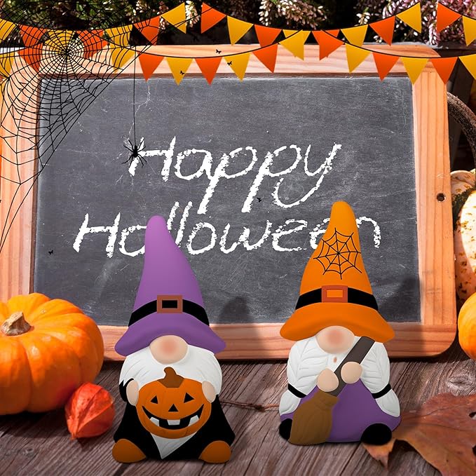 - Eye Catching Holiday Decoration and Gift: these Halloween ceramic gnomes after painting can be applied as eye catching decorations for your home, office, school, Halloween parties, trick or treat, etc., adding a festive atmosphere to your holidays; With their delicate designs, one gnome holding a pumpkin and the other hold besom; And they are also lovely gifts for your family, friend, partners and so on