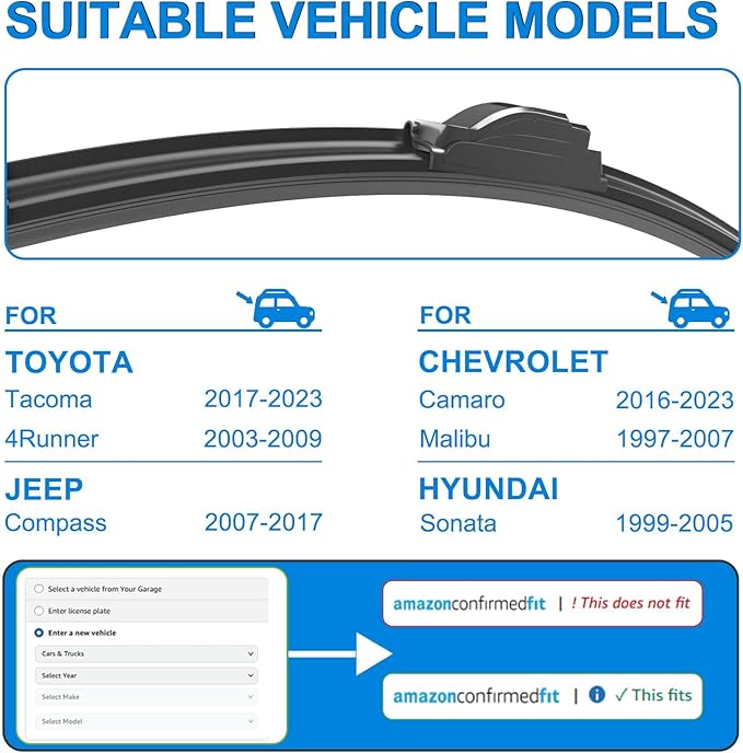 - 【Applicable vehicle models】Replacement for 2017-2023 toyota tacoma wiper blades,2003-2009 toyota 4runner wiper blades,2016-2024 chevrolet camaro wiper blades,2001-2006 hyundai santa fe wiper blades,1999-2005 hyundai sonata wiper blades,2008-2015 scion xb wiper blades,2000-2004 subaru crosstrek wiper blades etc.