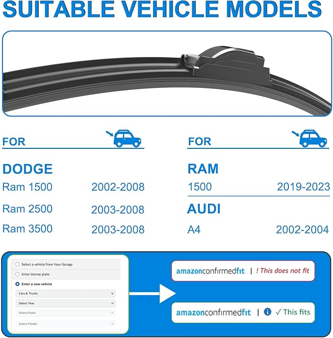 - 【Applicable vehicle models】Replacement for 2002-2008 dodge ram 1500 windshield wipers,2003-2008 ram 2500 windshield wipers,2003-2008 ram 3500 windshield wipers,2002-2004 audi a4 wiper blades,1995-1998 honda odyssey wiper blades,1998-2002 camaro wiper blades,2002-2005 kia sedona windshield wiper blades etc.