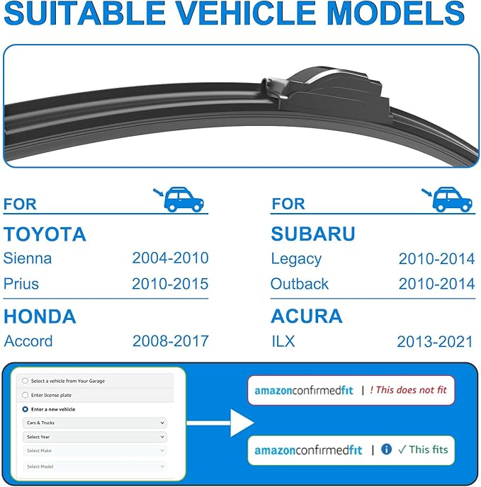 - 【Applicable vehicle models】Replacement for 2008-2017 honda accord wiper blades,2004-2010 toyota sienna wiper blades,2010-2016 toyota prius wiper blades,2010-2014 subaru outback windshield wipers,2003-2005 murano wiper blades,2019 hyundai tucson wiper blades etc.