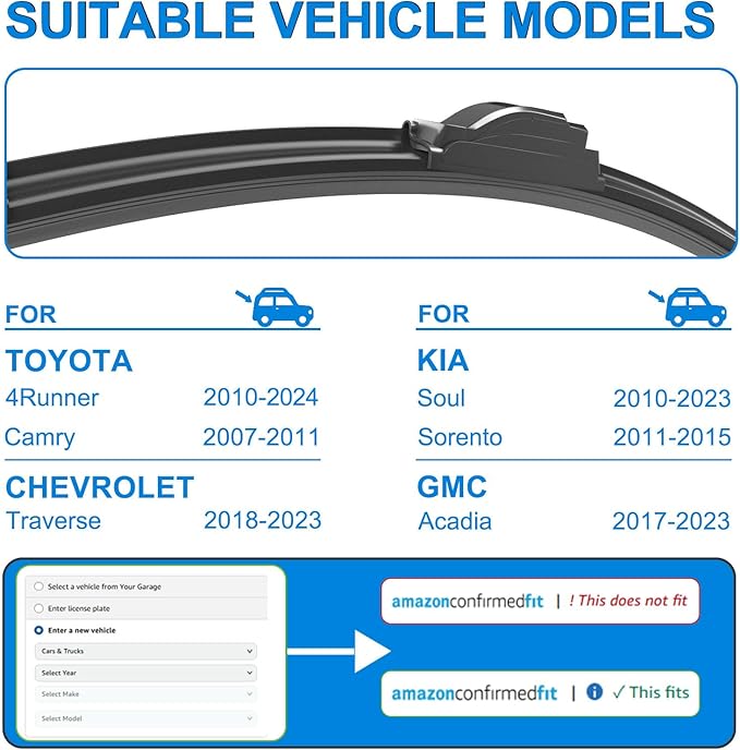 - 【Applicable vehicle models】Replacement for 2010-2024 toyota 4Runner wiper blades,2007-2011 toyota camry wiper blades,2010-2024 kia soul wiper blades,2006-2010 hyundai sonata wiper blades,2014-2018 bmw x5 wiper blades,2018-2023 chevrolet traverse wiper blades etc.