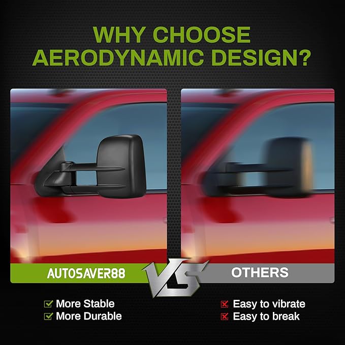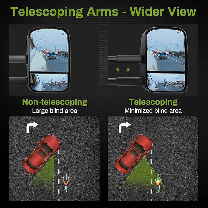 - Telescoping & turn signal: unlike non-adjustable mirrors, these trailer tow mirrors effectively extend line of sight to provide a larger viewing area; and turn signal makes it easy to spot to increase safety when turning or changing lanes