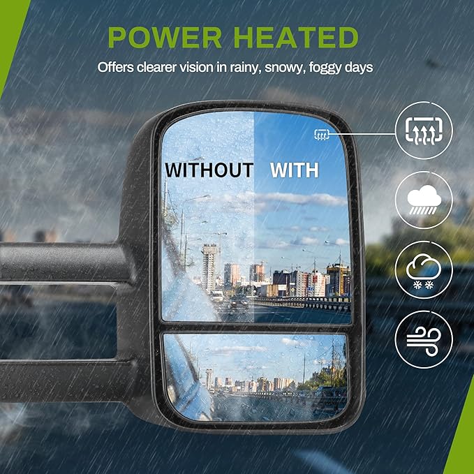 - Power heated: this plane mirror can remove the frost and mist to keep it clear when driving in rain and snowfall weather