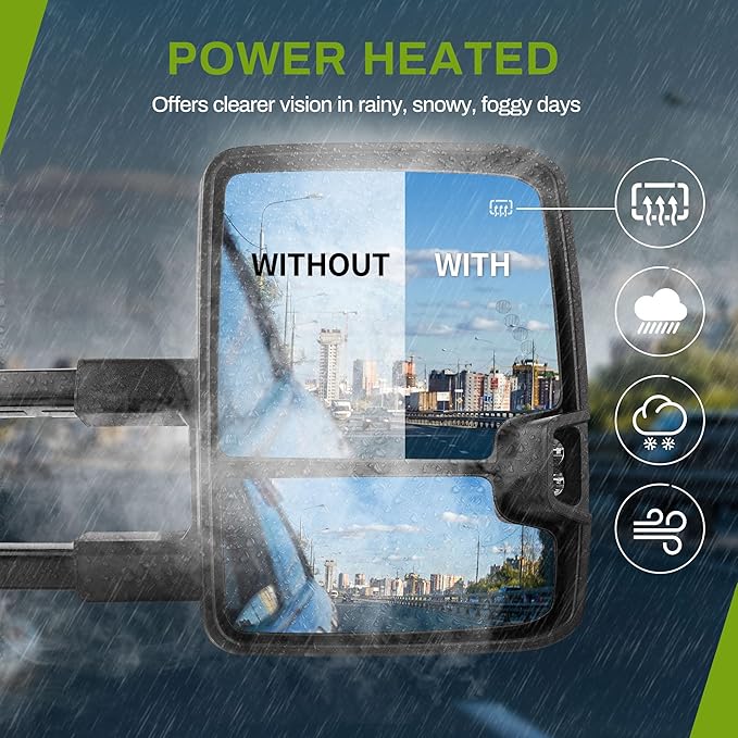- Power heated: this plane mirror can remove the frost and mist to keep it clear when driving in rain and snowfall weather