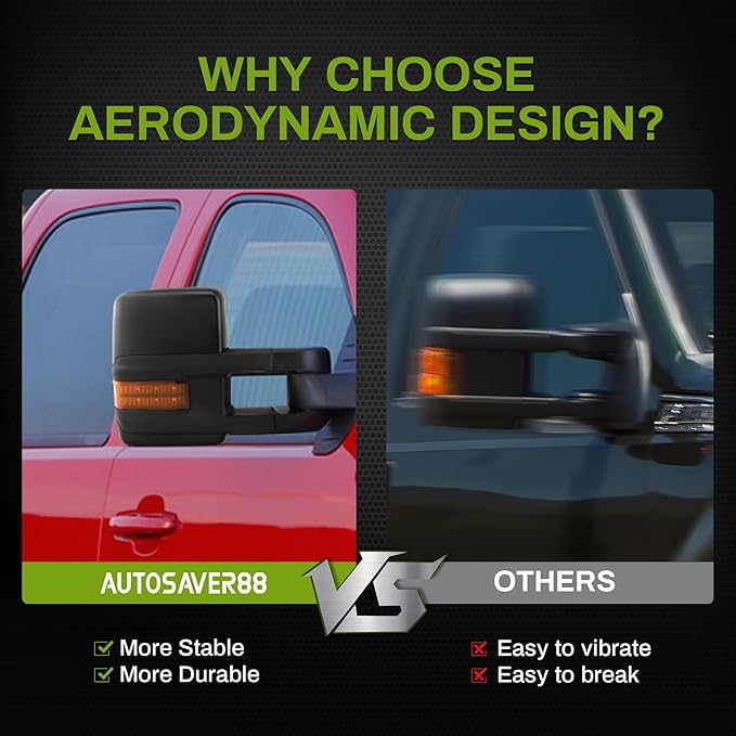 AUTOSAVER88 Towing Mirrors Compatible with 2007-2013 Chevy Silverado GMC Sierra 1500 2500HD 3500HD Extendable Power Heated Amber LED Turn Signal Manual Telescoping Folding Black Housing